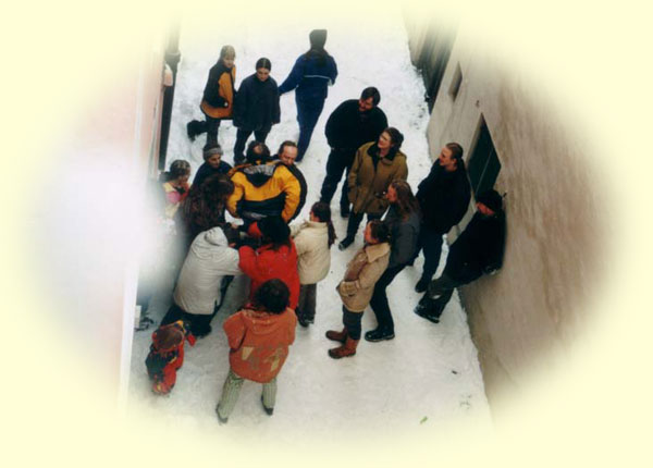 Schnee nach einem Tuch sucht, auf dem einer der 128 Sippennamen steht.